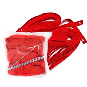 В комплекте 4 ленты из прочного полиэстера (2 шт. длиной 8 м и 2 шт. длиной 16 м) шириной 3 см каждая с металлическими люверсами и 4 металлических колышка для соединения лент (через люверсы) и их фиксации и регулировки натяжения.