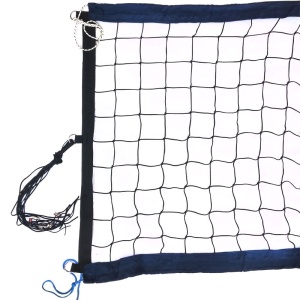 Верхние и нижние ограничительные ленты шириной 7,5 см из полиэстера синего цвета, боковые ленты шириной 5 см из полиэстра черного цвета. Полотно сетки из специального светостабилизированного, водоотталкивающего пропилена черного цвета (толщина нити 3 мм, ячейка 10см*10см). Применение данных материалов позволяет использовать сетку на открытых площадках при игре в агрессивных погодных условиях (яркий свет, дождь, высокая влажность, низкая температура воздуха) без угрозы растяжения и провисания полотна сетки, и разрушения структуры материала. Для равномерного натяжения сетки в боковых лентах предусмотрены по 3 полипропиленовых шнура с каждой стороны, а также в боковые ленты вставлены фибергласовые стрежни, за счет чего сетка выглядит ровно натянутой даже при недостаточном натяжении троса и боковых шнуров.